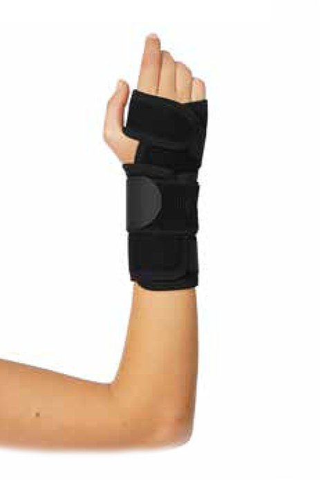 Неопреновий бандаж для фіксації зап'ястя забезпечує надійну підтримку кисті та зап'ястя в різних умовах. У нижній частині виробу використовується долонна шина анатомічного профілю, яка ефективно іммобілізує променево-зап'ястковий суглоб: утримує зап'ястя у функціональному положенні для дорсального згинання, забезпечуючи повний діапазон рухів пальців і великого пальця. Бандаж можна знімати для проведення терапевтичних сеансів, миття та гігієни.