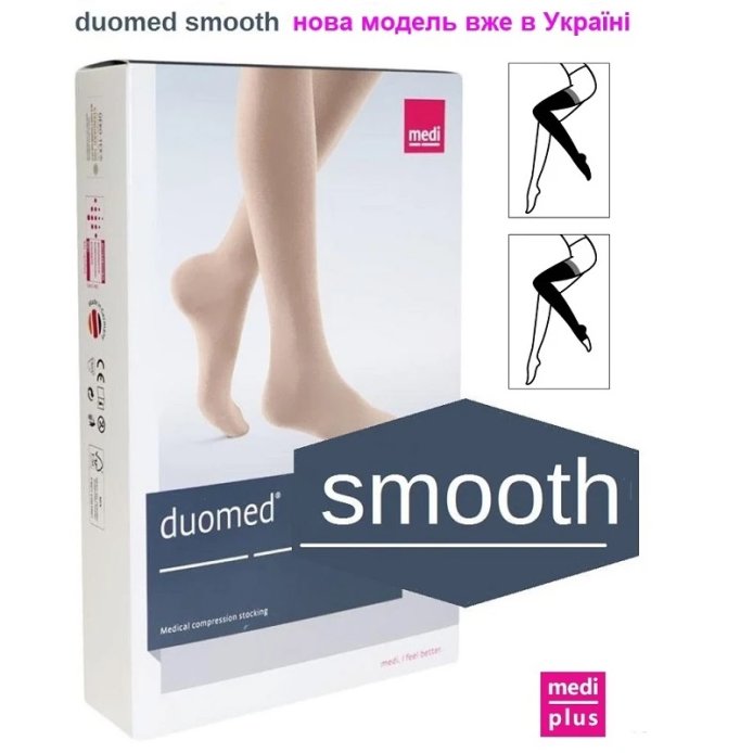Нові привабливі компресійні панчохи duomed® smooth поєднують медичну ефективність зі стильною елегантністю. М'яка трикотажна тканина забезпечує чудовий комфорт при носінні та є приємною для шкіри. Компресійні вироби мають привабливий вигляд з легким блиском та представлені у двох кольорах: чорний та карамель. Як на роботі, так і у вільний час компресійні трикотаж duomed® smooth є надійним супутником у терапії вен, адже він забезпечує ефективну компресію і водночас гарно пасує до вашого вбрання.