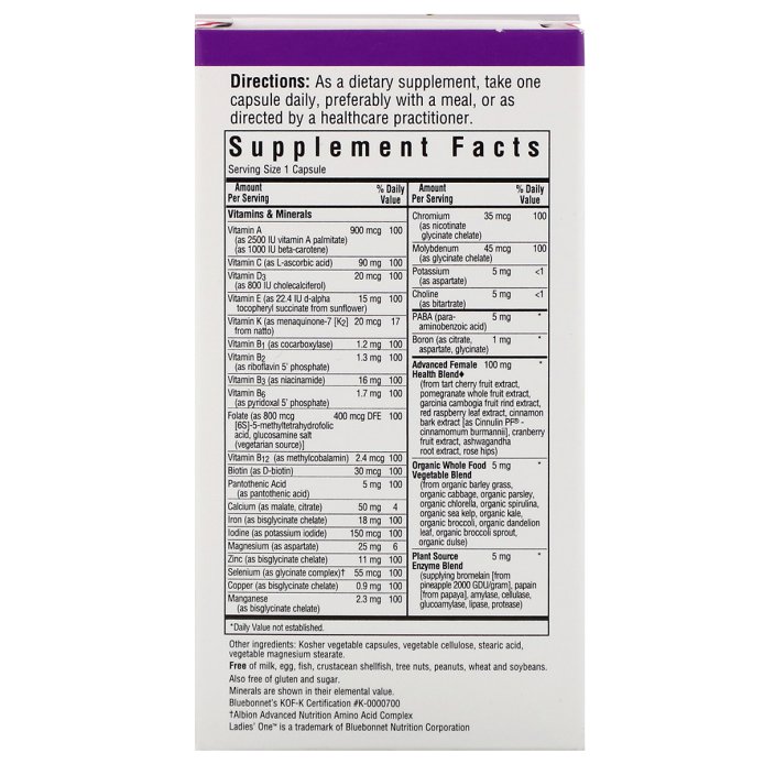 Ladies' One отBluebonnet - это однократная ежедневная мультивитаминная и мультиминеральная диетическая добавка, которая разработана с использованием высокоэффективных хелатных минералов и популярных каротиноидов, натуральных экстрактов и растительных ферментов.
