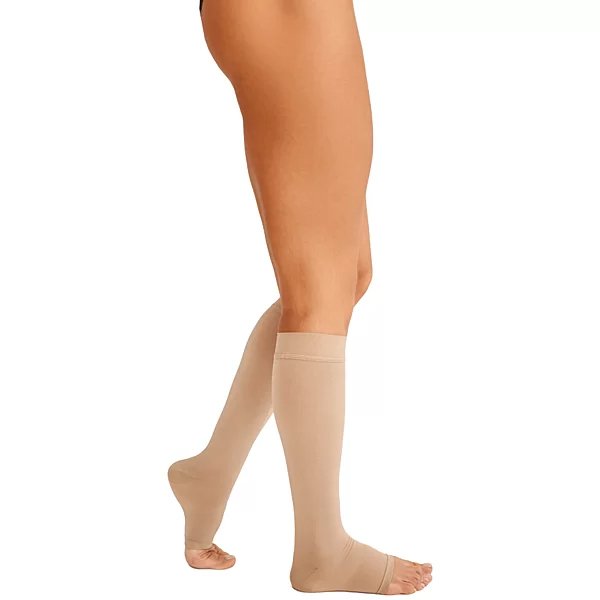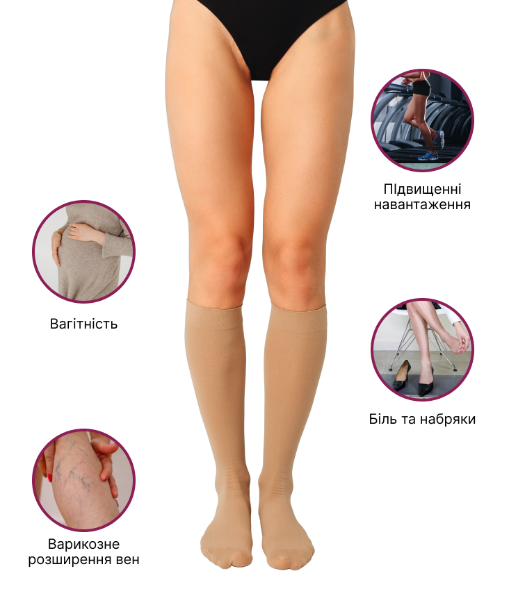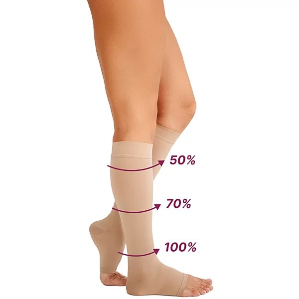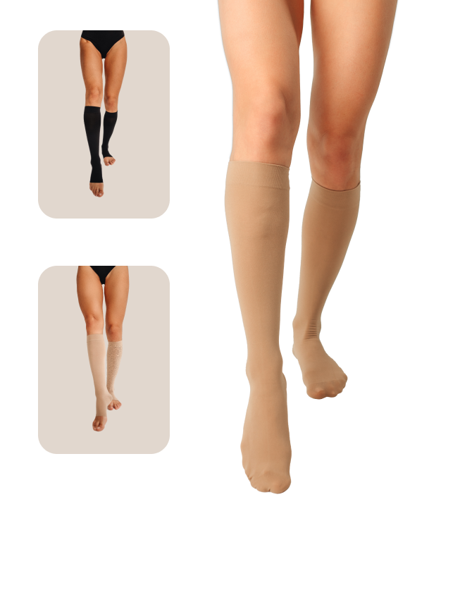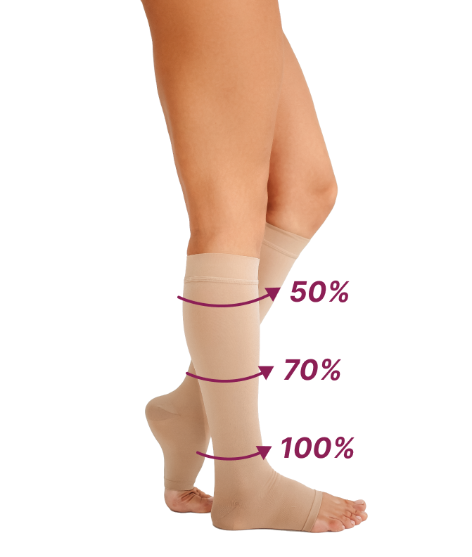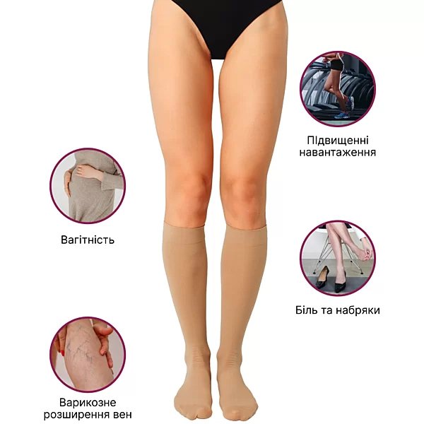 Медичні компресійні гольфи виготовлені з медичного трикотажу, забезпечують ідеальну посадку і завдяки помірному рівню компресії можуть бути рекомендовані для носіння на початкових стадіях захворювань вен. Градуйована компресія ефективно розподіляє тиск знизу вгору, найбільший тиск у ділянці гомілки, який поступово зменшується, що сприяє покращенню циркуляції крові.
