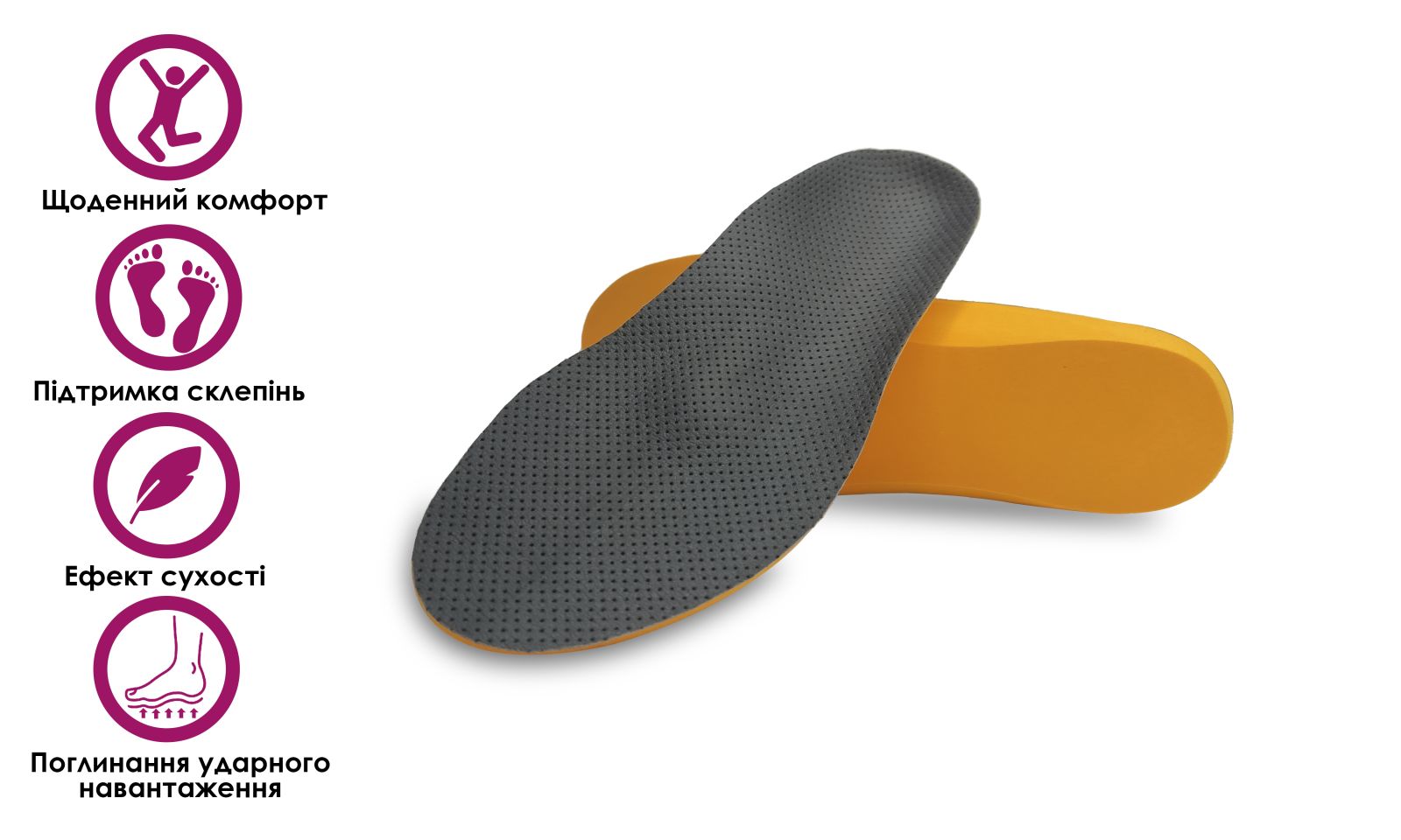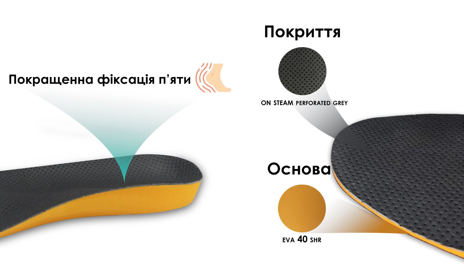 - Фіксація п'яти, надійна підтримка склепінь, рівномірний розподіл навантаження на стопи;