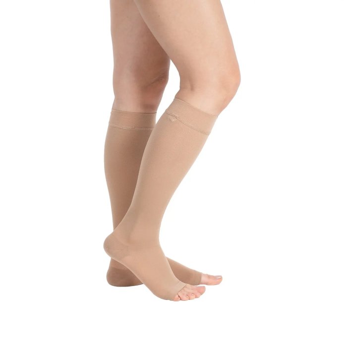 Компресійні гольфи 2-го класу компресії (23-32 мм рт. ст.) З відкритим носком. Широка та м'яка гумка надійно фіксує виріб на нозі та не перетискає м'які тканини. Антибактеріальна нитка запобігає запаху поту та надовго зберігає свіжість ніг. Ділянки п'яти та шкарпетки укріплені, тому гольфи менше піддаються механічним пошкодженням, використовують для лікування варикозної хвороби, усунення лімфовенозних набряків, профілактики тромбоемболічних ускладнень, після оперативних втручань на лімфовенозна магістралях і нижніх кінцівках, нижніх кінцівок.
