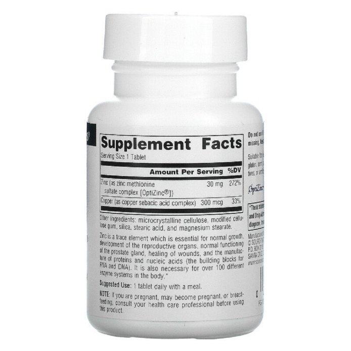 OptiZinc® от Source Naturals — это форма цинка в комплексе с аминокислотой метионин. Исследования показали, что данная формула лучше поглощается организмом и является самой биодоступной.