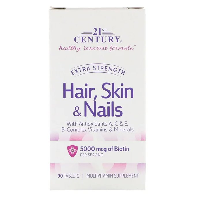 Усиленная формула для Волос, Кожи и Ногтей, 21st Century направлена на борьбу не только с косметической стороной проблемы ослабленных волос, ногтей и кожи, а и прежде всего с ее внутренними факторами. Эта добавка, в состав которой входит Биотин, витамины А, С, Е и группы В обеспечит питательными веществами организм изнутри, благодаря чему волосы перестанут выпадать, станут более густыми и блестящими, приобретут здоровый вид; ногти станут более крепкими, а кожа упругой.