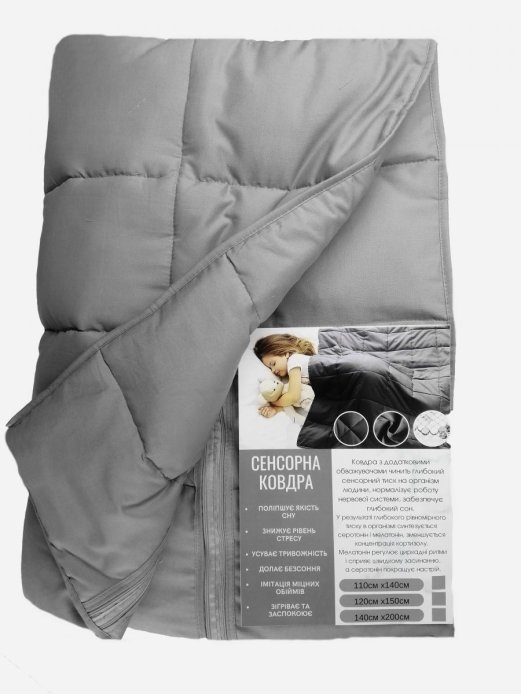 Сенсорное (утяжелённое) одеяло 110 см Х 140 см Модули с наполнителем съёмные. Внешний слой одеяла - бязь Внутренний слой - синтепон. В качестве утяжелителя используются гранулы полимерного гипоаллергенного материала. Может выполняться в любых размерах. Показания к использованию: сенсорные расстройства, расстройство аутистического спектра, СДВГ, ДЦП, болезнь Альцгеймера, ПТСР, болезнь Паркинсона, синдром Туретта, синдром беспокойных ног, нарушения сна, тревога во время менопаузы. Используется как помощь в борьбе с депрессией, маниями, тревогой, травмами и паранойей.