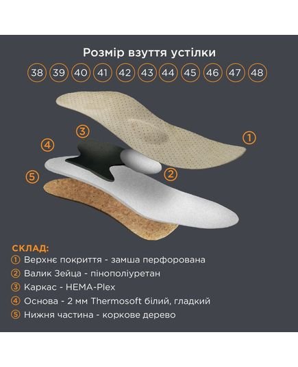 - зворотня, нижня частина устілки в зоні п’ятки та середньої частини стопи покрита пробковим екологічним матеріалом