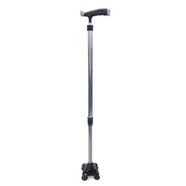 - Трость имеет широкую четырехопорную основу, которая обеспечивает высокую устойчивость на различных поверхностях и снижает риск скольжения;