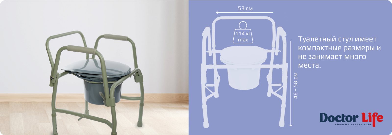 Туалетный стул Doctor Life придаст удобства, как пользователю так и лицу за ним ухаживающему. Стул имеет стойкую конструкцию со съемной крышкой и ведро. Материал изготовления отличается высокой стойкостью к химическим реагентам и дезинфицирующим средствам.