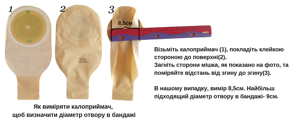 • Діаметр отвору для стоми стандартний - 5см, 7см, 8см, 9см, а також для квадратного калоприймача 10см на 10см і без отвору (глухий).
