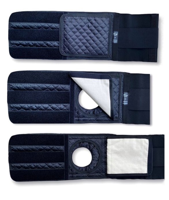 • Бандаж укомплектований знімним модулем з необхідним отвором, зміщеним до краю. Такий модуль можна обертати на 360 градусів і вибирати саме зручне розташування отвору по відношенню до виведеної стоми.