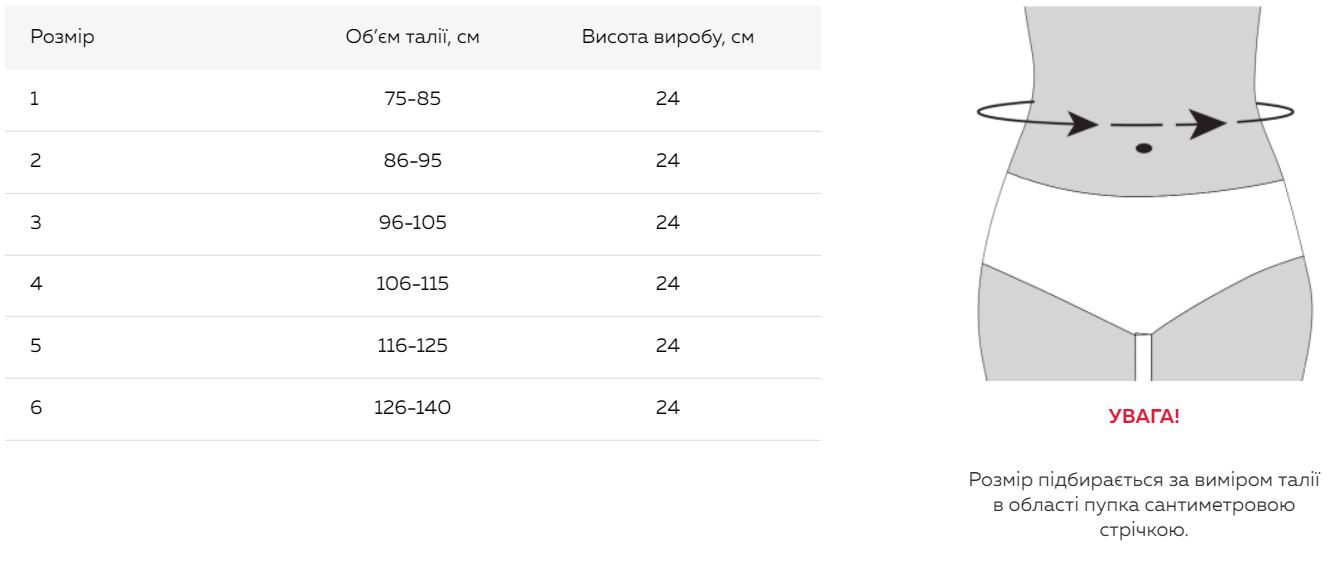 - Розмір підбирається по заміру талії в області пупка сантиметровою стрічкою