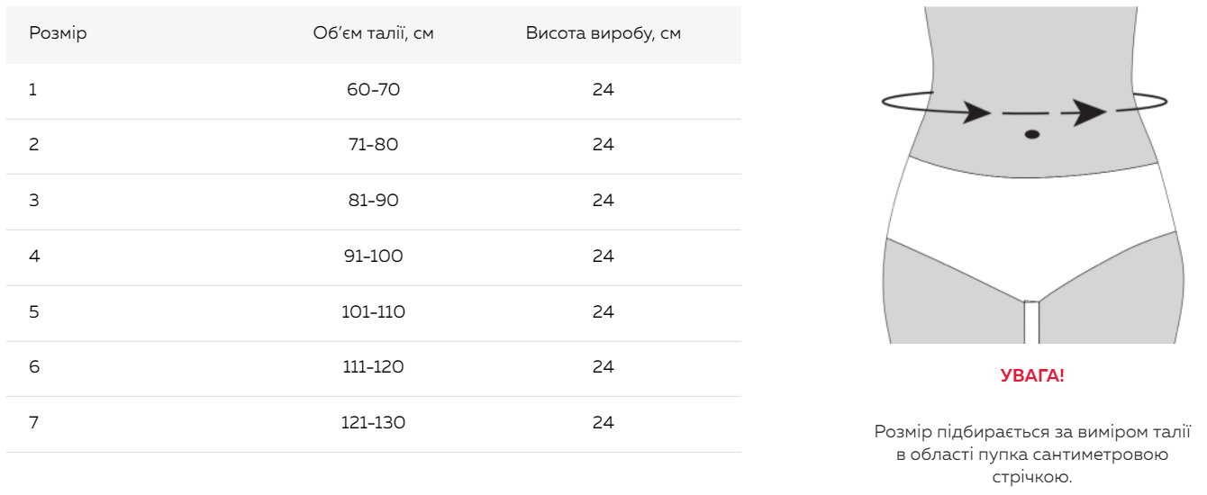 - Розмір підбирається по заміру талії в області пупка сантиметровою стрічкою