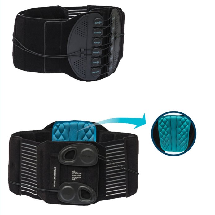 З обох боків системи натягу розташовані гнучкі пластикові елементи, які забезпечують стабілізацію поперекового відділу хребта, підтримуючи його в анатомічно правильному положенні. На відміну від традиційних бандажів із металевими вставками, ці пластикові опори легші, більш гнучкі та зручні, що дозволяє користувачу вільніше рухатися, не жертвуючи ефективністю підтримки.
