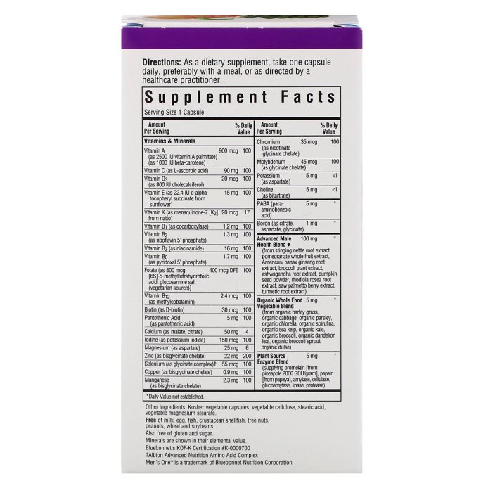 Men's One отBluebonnet - це одноразова щоденна мультивітамінна та мультимінеральна дієтична добавка, яка розроблена з використанням високоефективних хелатних мінералів і популярних каротиноїдів, натуральних екстрактів і рослинних ферментів.