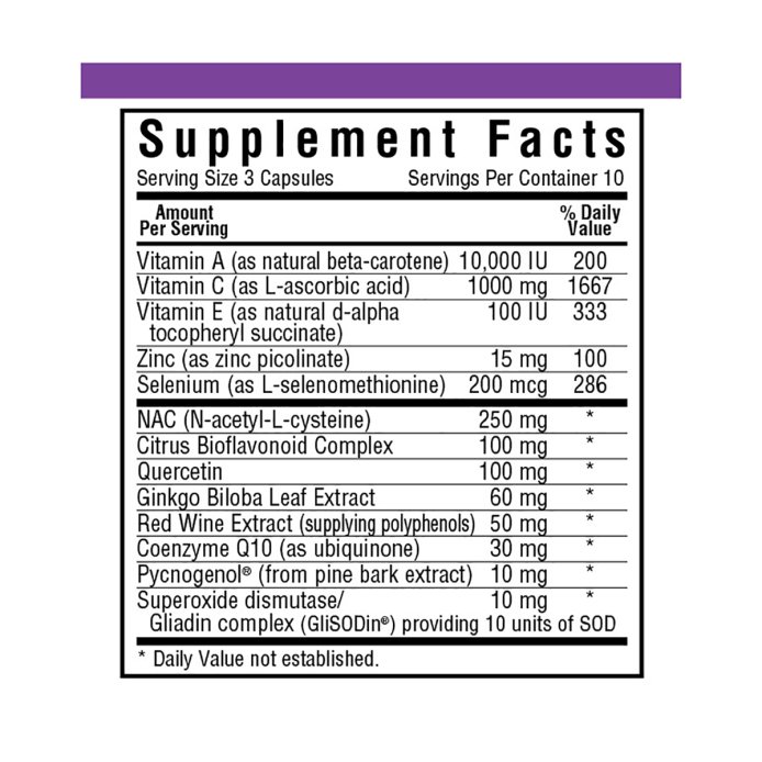 Антиоксидантна формула поєднує в собі найпотужніші природні антиоксиданти, вітаміни, мінерали та трави. Природна система з пролонгованим вивільненням гарантує, що даний комплекс буде працювати протягом тривалого часу.