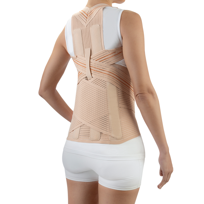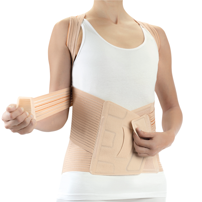 - 2 ремені перехрещуються на спині, проходять під пахвами та застібаються на животі, дозволяючи налаштовувати компресію відповідно до потреб користувача;