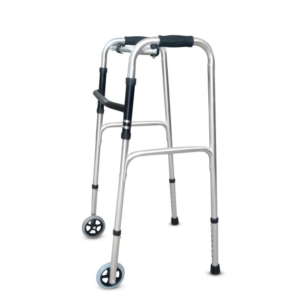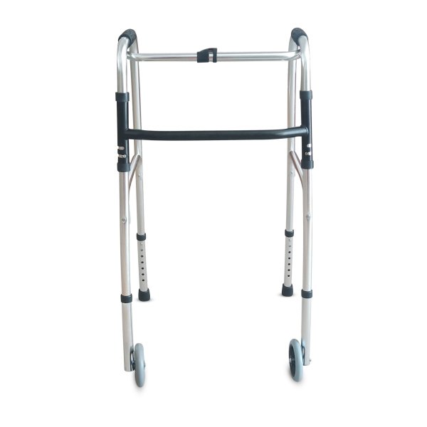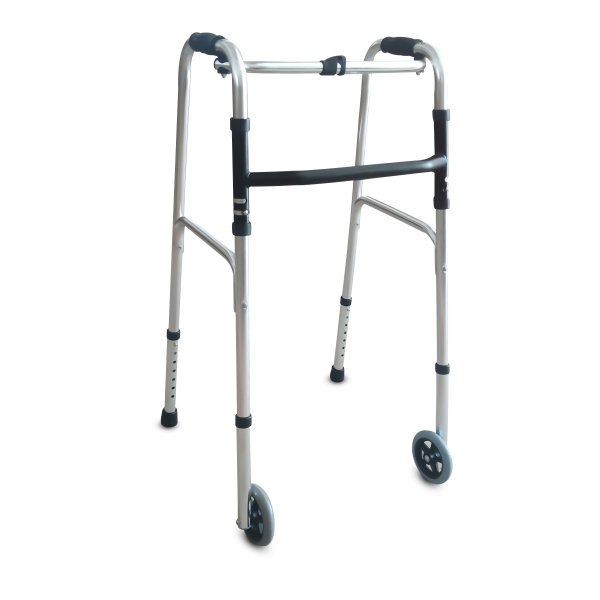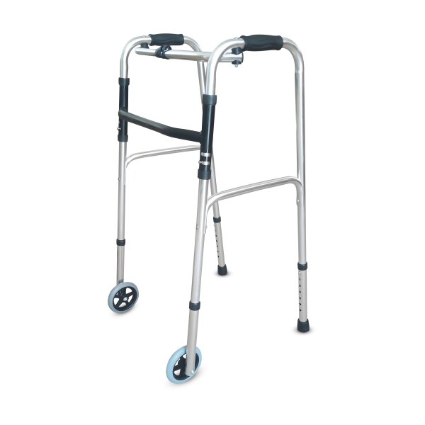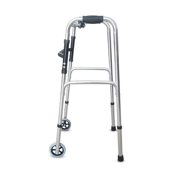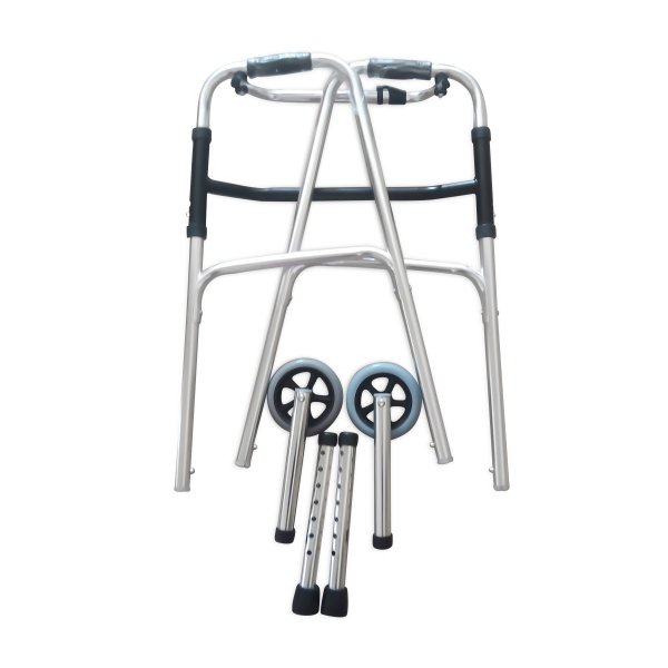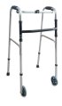 Ходунки крокуючі складні 804D з двома колесами від Toros-Group (Тип 1068) для дорослих призначені для опори при ходьбі людей, які мають травми і захворювання нижніх кінцівок, а також осіб з обмеженими фізичними можливостями та людей похилого віку. Ходунки складні 804D, з двома колесами складаються з каркасу (високоміцна труба з алюмінієвого сплаву) та поручнів (термопластична гума), гумових наконечників та кріпильних елементів. Підтримуються чотирма ніжками, можуть використовуватися з інвалідними візками, легко регулюються по висоті.