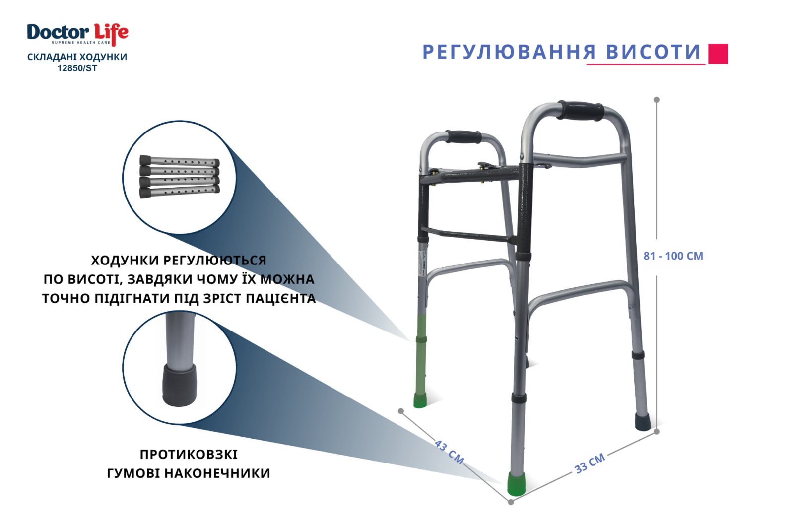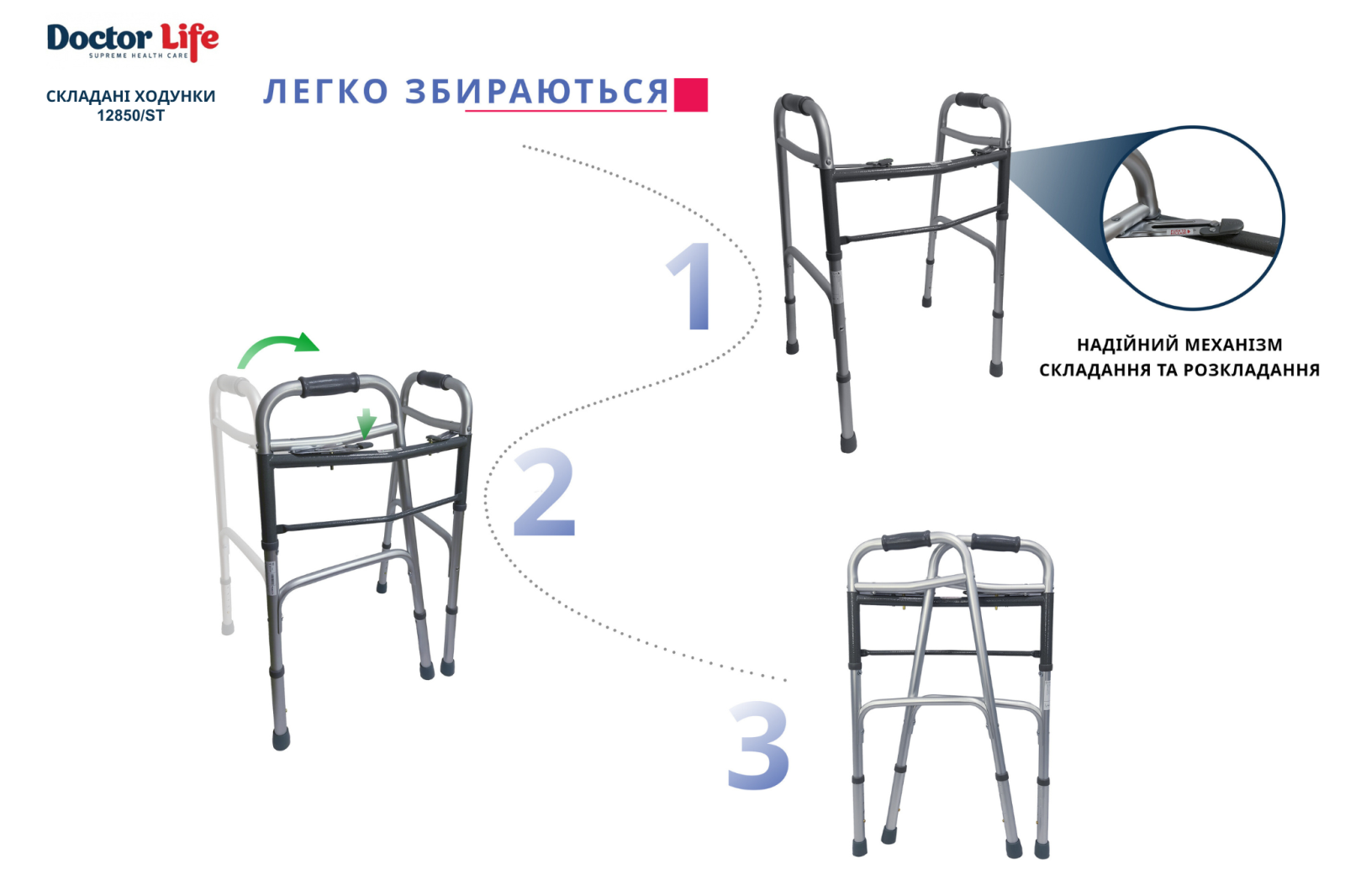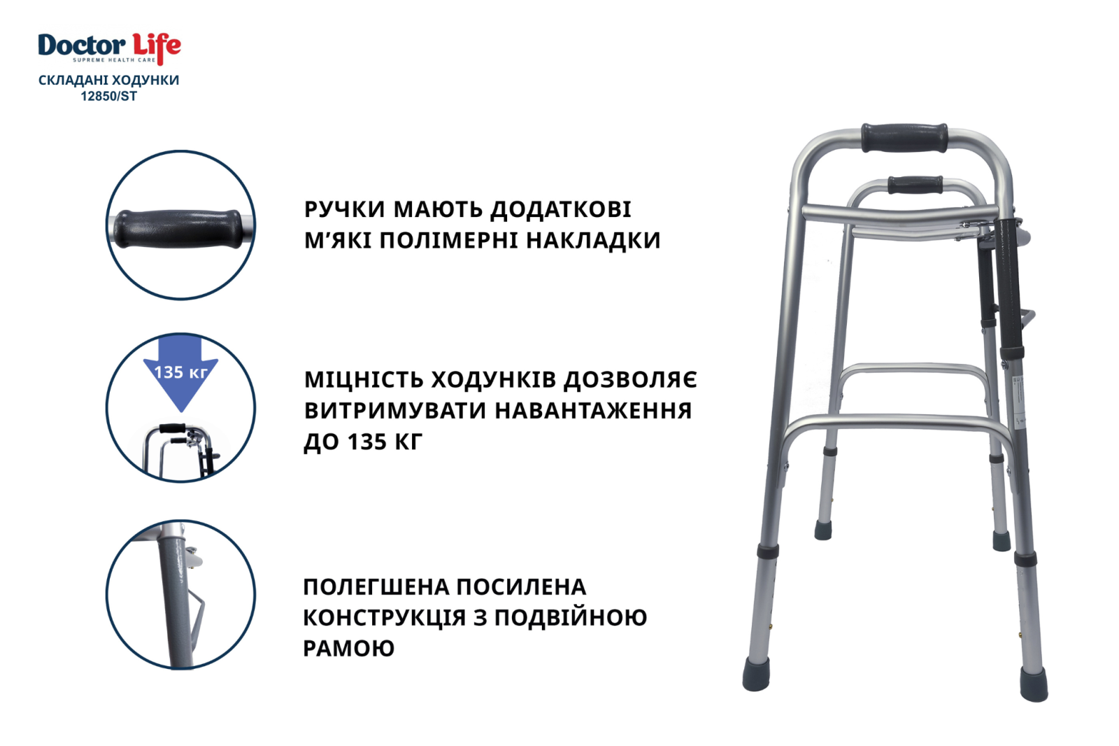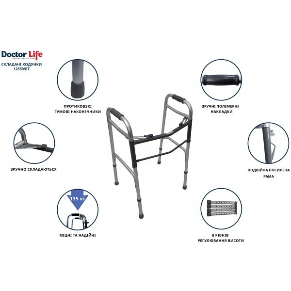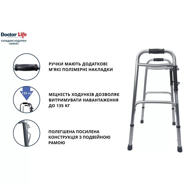 Складані ходунки Dr.Life 12850/ST мають міцну, стійку та ергономічну конструкцію, призначені для осіб з обмеженими можливостями пересування.