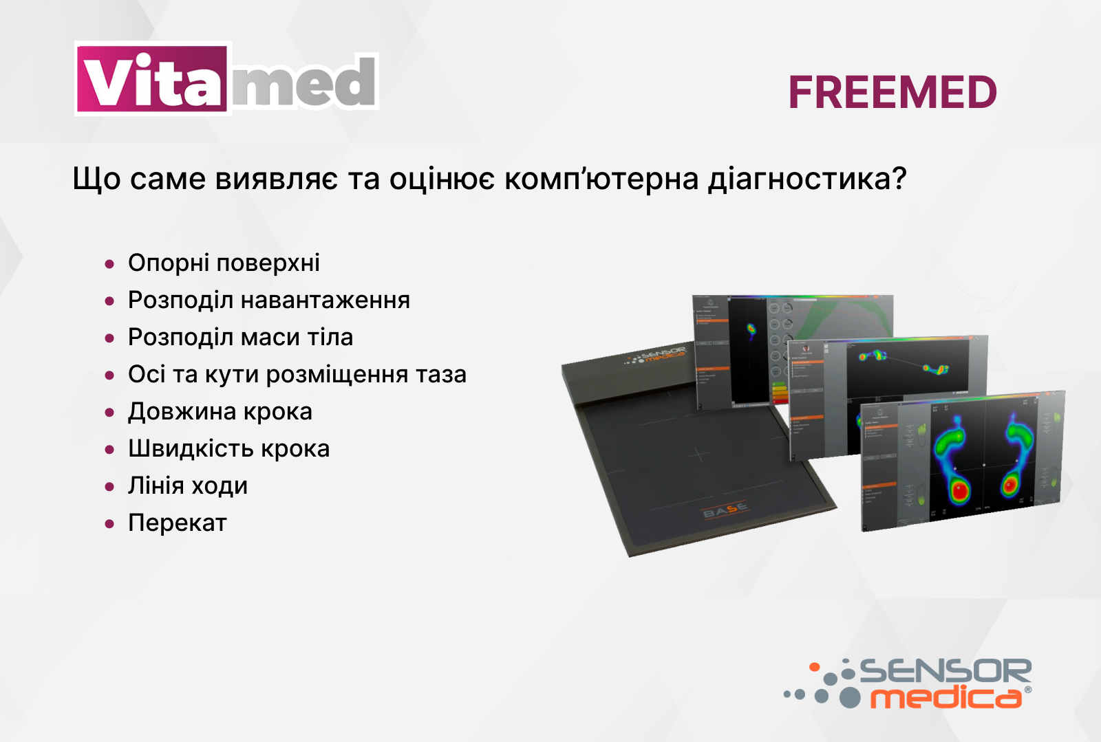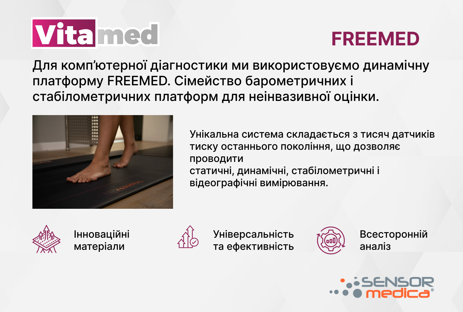Індивідуальні ортопедичні устілки Vitamed Basic - виготовляються відповідно до модернізованої італійської методикою діагностики стопи. У виробництві дотримується традиційна інноваціооная техніка та технологія тривимірного фрезерування і друку. В універсальну платформу Freemed входять тисячі датчиків нового покоління, які проводять статичні, динамічні, відеографіческіх вимірювання. Програма виводить автоматичний звіт, який містить велику інформацію для діагностики патології та правильної інтерпретації отриманих даних в моделюванні індивідуальних устілок. Вся інформація зберігається в індивідуальних картах клієнтів, що дає можливість оцінити результативність протягом усього часу.