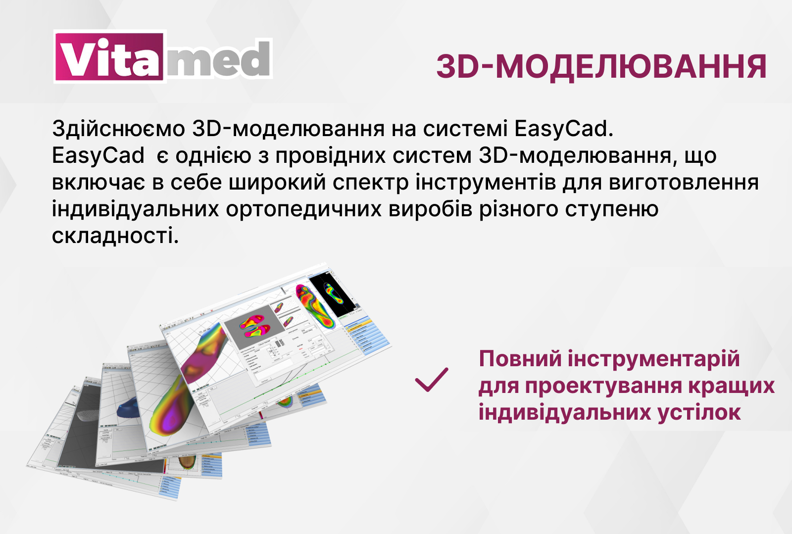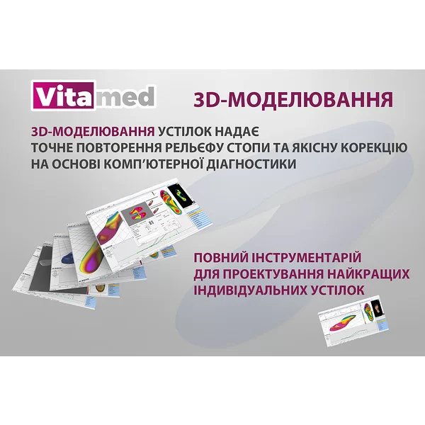- 3D-моделювання устілок надає точне повторення рельєфу стопи і якісну корекцію на основі комп'ютерної діагностики.
