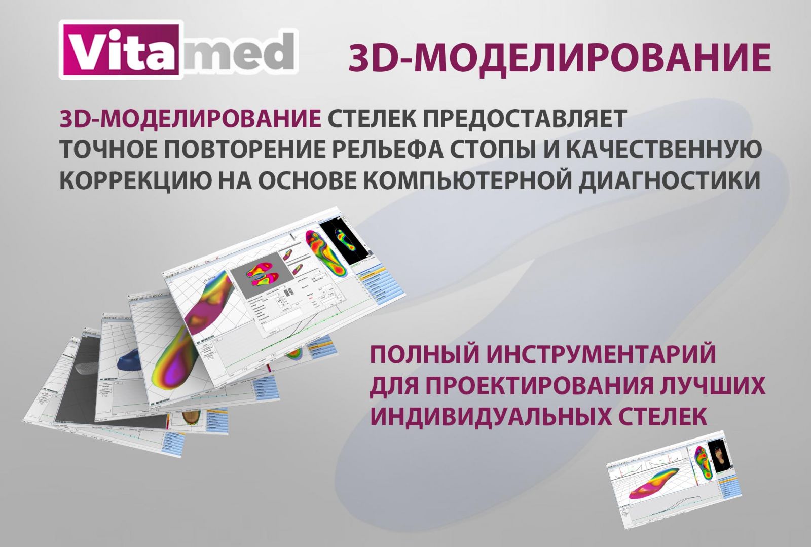 - 3D-моделювання устілок надає точне повторення рельєфу стопи та якісну корекцію на основі комп'ютерної діагностики;