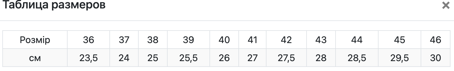 Розмір | 36, 37, 38, 39, 40, 42, 41, 43, 44, 45, 46 |