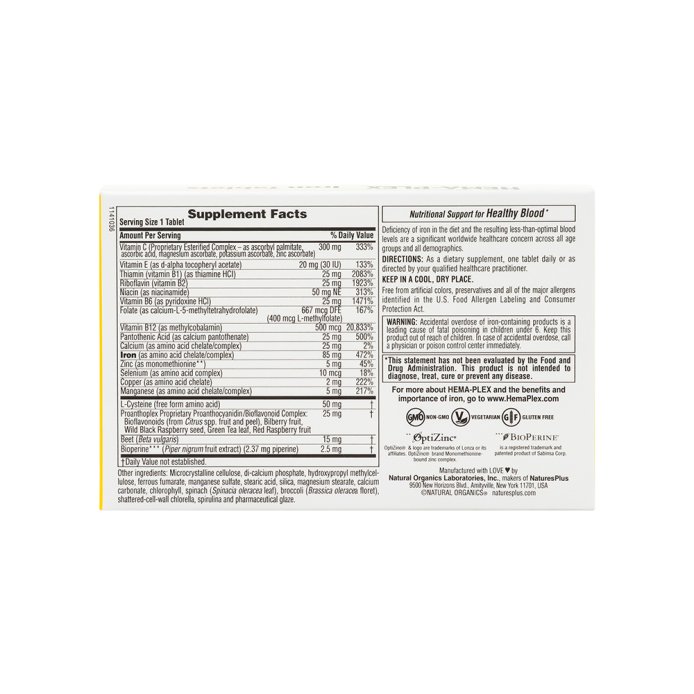 Комплекс Hema-Plex від Nature's Plus забезпечує потужну живильну підтримку для загального здоров'я крові. У формулу цього комплексу входять такі важливі для здоров'я крові елементи, як залізо, вітаміни С і Е, вітаміни групи В, а також мідь і фолієва кислота. Залізо і вітамін В12 входять до складу гемоглобіну. Це білок, з якого складаються еритроцити. Залізо відповідає за захоплення кисню. Потім, за допомогою вітаміну В12 і міді кисень розходиться по кровотоку і поставляється в усі органи в людському тілі. Еритроцити також відповідають за збір вуглекислого газу і переміщення його в легені для усунення з організму. Вітаміни групи В, а також вітаміни С і Е зміцнюють стінки судин, тим самим перешкоджаючи виникненню різного роду кровотеч. В якості харчової добавки приймати по 1 таблетці в день. Зберігати в щільно закритій упаковці, в сухому і прохолодному місці. Випадкове передозування продуктів, що містять залізо, - основна причина отруєнь зі смертельним результатом серед дітей до 6 років. Зберігати в недоступному для дітей місці. При випадковому передозуванні слід негайно звернутися до лікаря або в токсикологічний центр.