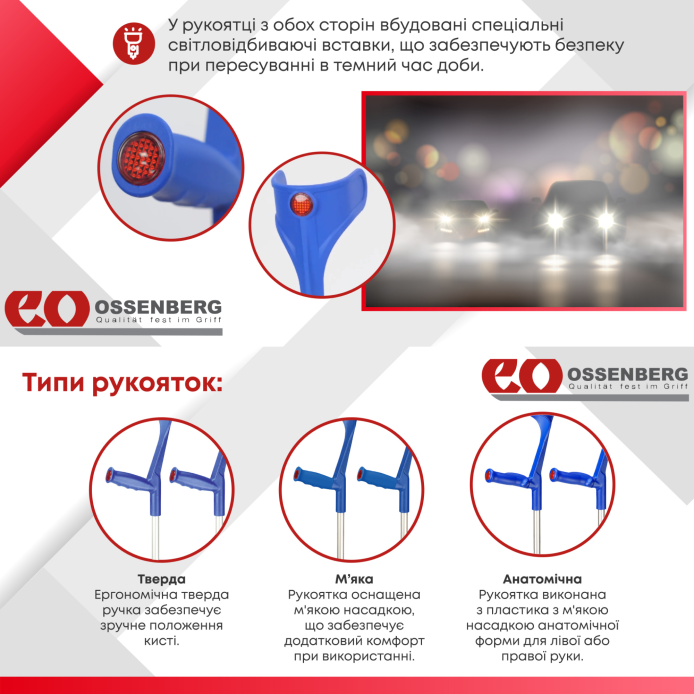 Полегшені милиці з регулюванням по висоті. Милиці Ossenberg Klassiker виготовлені з високоякісного алюмінію, який пройшов обробку анодуванням, що в рази збільшує термін придатності і міцність матеріалу. Ергономічна рукоятка виготовлена із високоякісного пластику. Система фіксації за допомогою кнопкового замка одним натисканням легко дозволяє відрегулювати потрібну висоту. Милиці також оснащені гумовими наконечниками з металевою вставкою, що значно продовжує термін використання. У рукоятки вбудовані світловідбивачі з обох боків для безпечного пересування у темний час.