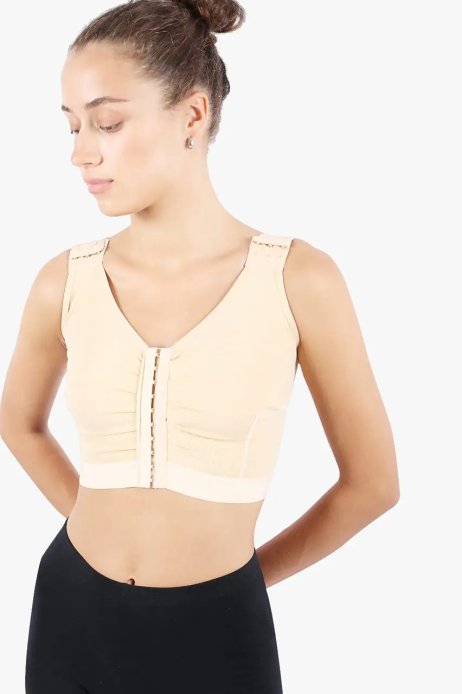 Передня застібка на гачки дозволяє легко регулювати ступінь компресії, що є особливо важливим у перші тижні після операції. Широкі бретелі зменшують навантаження на плечі, забезпечуючи комфорт протягом усього дня.
