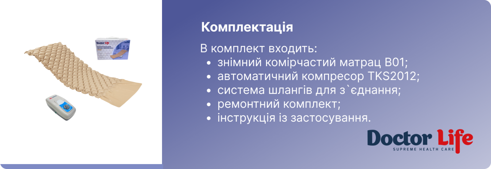 Протипролежневий комірчастий матрац Doctor Life B01-TKS2012 – для профілактики та лікування пролежнів, як у стаціонарі, так і в домашніх умовах, у пацієнтів з ураженнями опорно-рухового апарату та центральної нервової системи, важкими соматичними захворюваннями, що супроводжуються тривалими вимушеними нерухомими положеннями тіла.