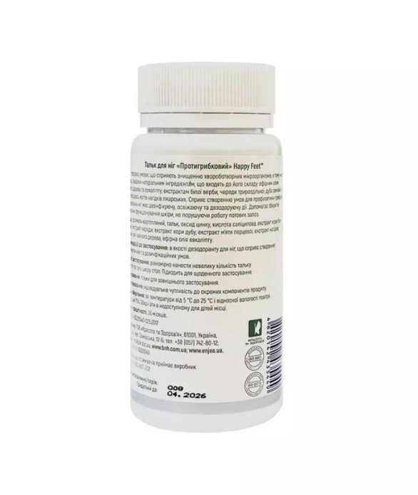 ТАЛЬК ДЛЯ НІГ HAPPY FEET ПРОТИГРИБКОВИЙ усуває основні симптоми грибка, завдяки натуральним інгредієнтам, що входять до його складу: ментолу, екстрактам кори білої верби, череди, кори дуба, м'яти перцевої, календули, ефірним оліям чайного дерева та евкаліпту. Крім цього, засіб містить у складі саліцилову і борну кислоти, які мають антисептичний, протимікробний та підсушуючий ефект.