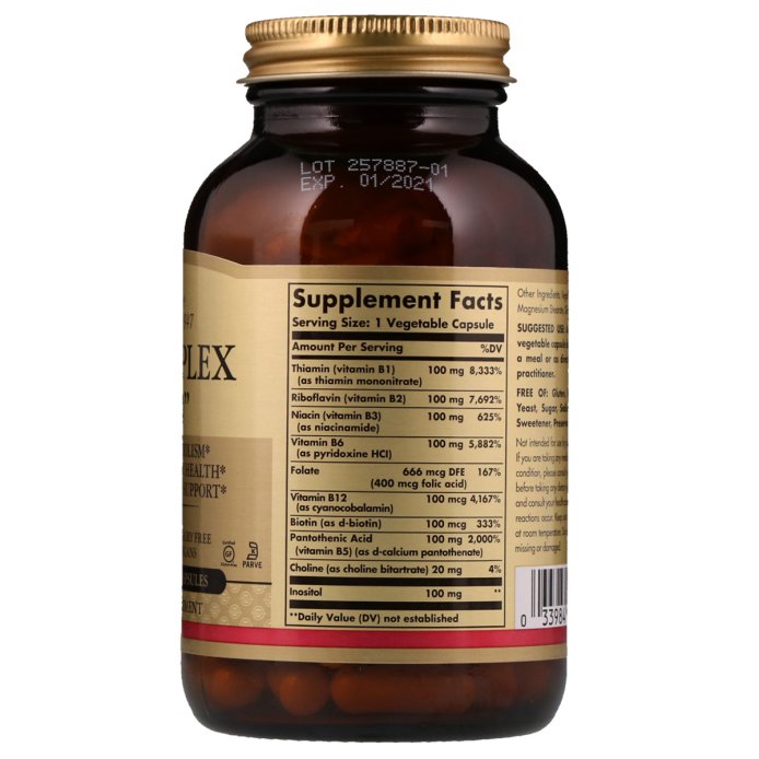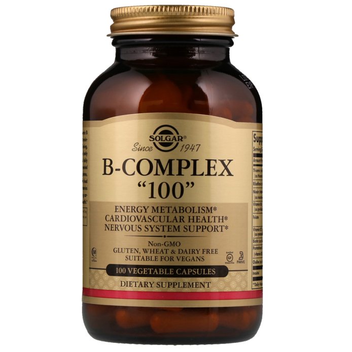 B-Complex "100" от Solgar обеспечивает все водорастворимые витамины группы В, которые играют важную роль в клеточном метаболизме. Когда-то данная группа считалась одним витамином. Позже исследования показали, что они являются отдельными составляющими, которые часто сосуществуют в одних и тех же продуктах. Добавки, содержащие все восемь витаминов группы В (тиамин, рибофлавин, ниацин, пиридоксин, кобаламин, биотин, фолат, пантотеновая кислота), называются комплексом витамина В.